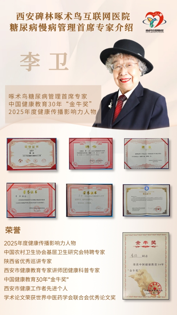 李卫,西安碑林啄术鸟互联网医院糖尿病慢病管理首席专家。84岁高龄,毕业于北京中医药大学,51年专注慢病防治,曾任北京广安门医院内分泌科主任医师。拥有30年糖尿病自我康复亲证经历,是国家一级教育讲师,荣获健康中国领军人物、健康传播影响力人物等多项权威奖项。她创立的社区健康教育志愿服务队,获国家级推广表彰。学术论文获世界中医药学会联合会论文奖,兼任多家学会特聘专家与学科带头人。